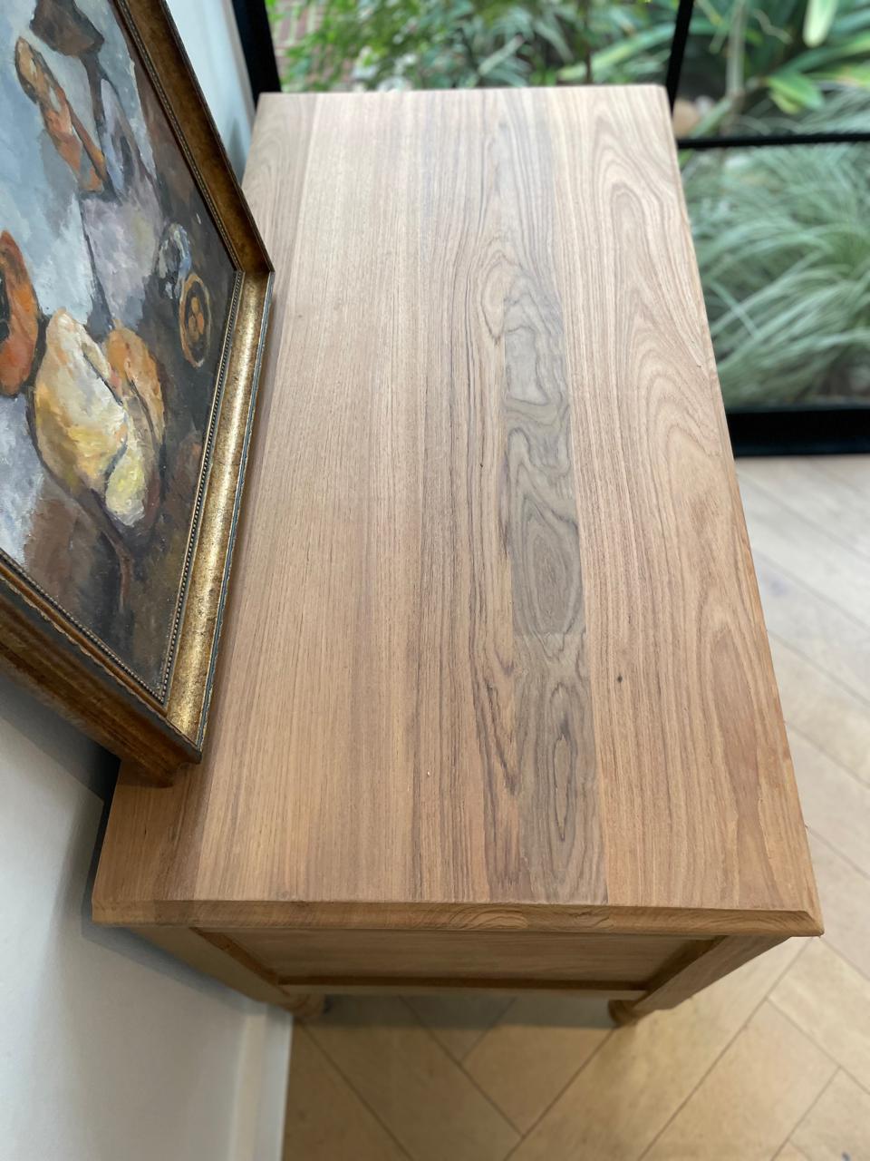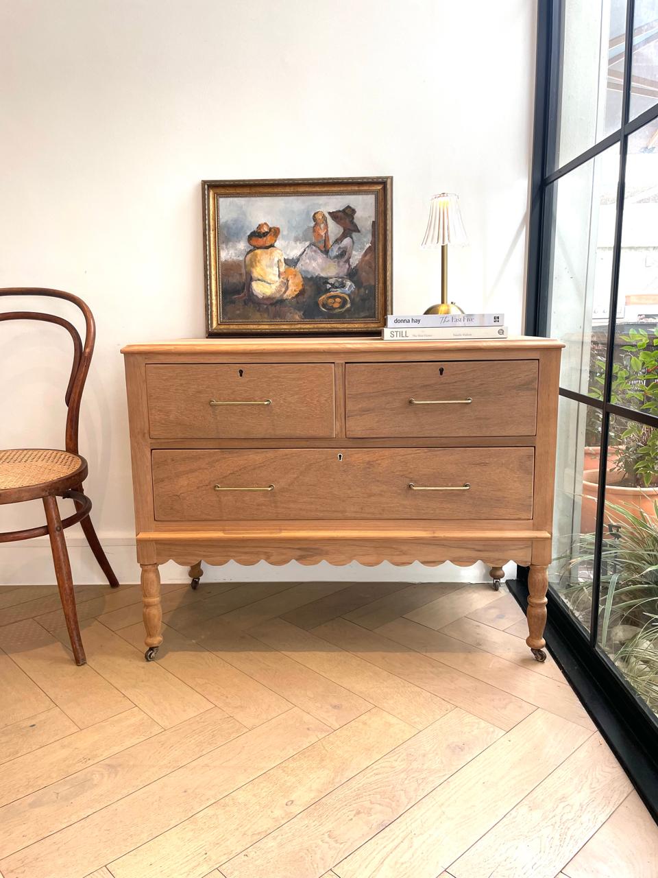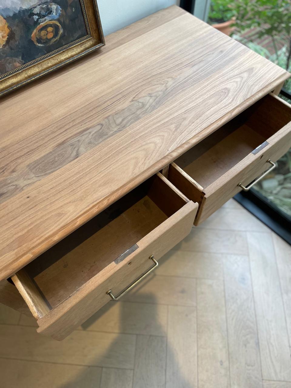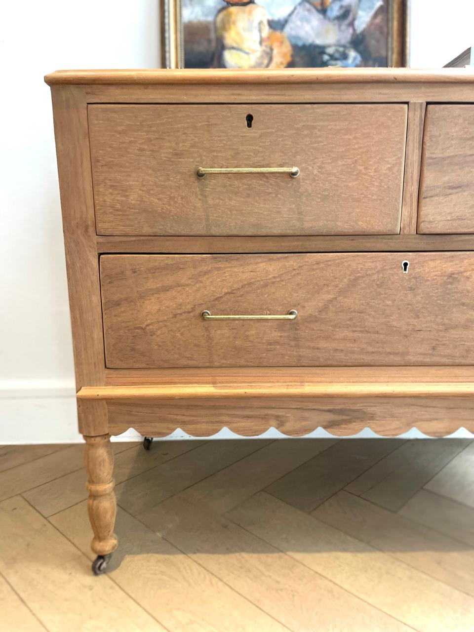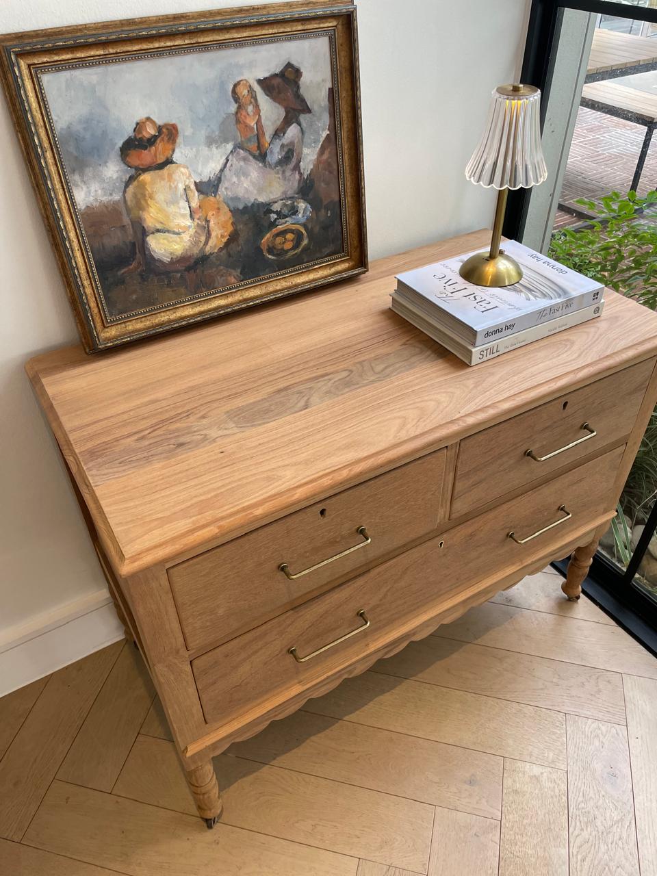 The Jasper Chest of Draws, crafted from solid, beautifully restored Teak wood, brings timeless elegance to your home. Featuring sleek solid brass handles and ornate leg details, this premium piece offers three oversized, smooth-sliding drawers for generous storage. Its slightly lower profile makes it perfect as an entrance hall table or placed behind a couch, adding sophistication wherever it stands. Durable and stylish, the Jasper Chest is as good as new.