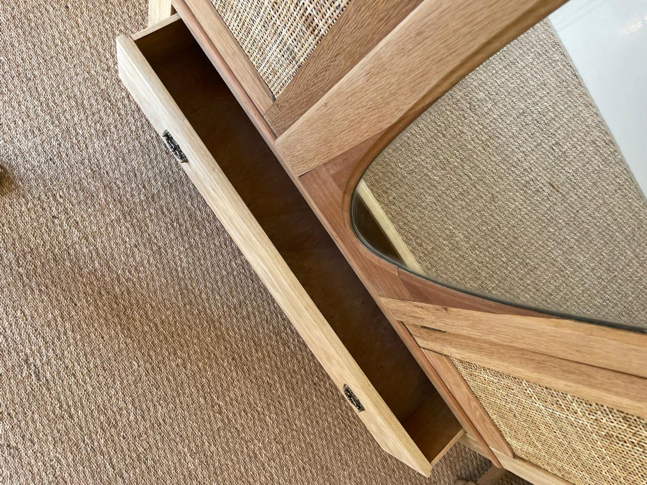 The timeless Ella Wardrobe, a stunning one-of-a-kind antique piece crafted from solid oak. This exceptional wardrobe features intricate inlaid rattan detailing and a beautiful mirror, showcasing the craftsmanship of a bygone era. Meticulously restored to perfection, every detail has been carefully preserved to highlight its unique character. with smooth-gliding drawers.