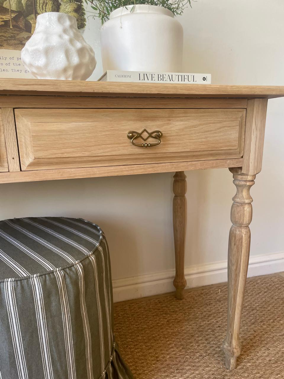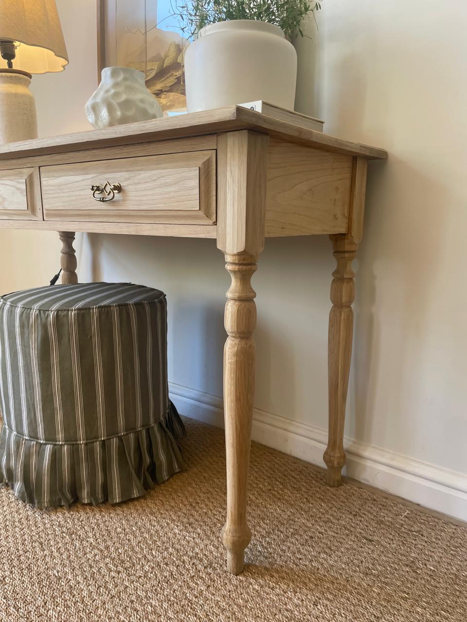 Discover timeless elegance with this one-of-a-kind English Dressing Table and Desk. Crafted from solid oak and meticulously restored, this substantial piece features an extended 1200mm length, ornate leg detailing, and refined bevelled edge accents. Two smooth-gliding drawers provide practical storage for your essentials. Whether styled as a dressing table or home office desk, its generous proportions and classic design make it a striking focal point for any room. A genuine vintage treasure.