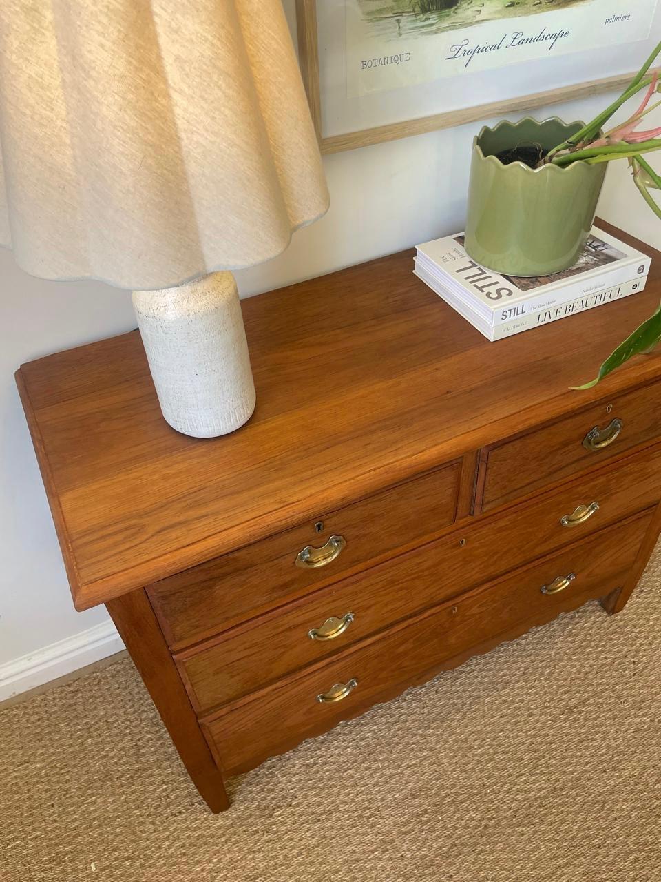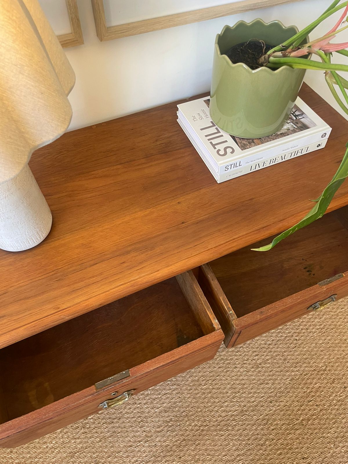 The Hannah Chest of Drawers is a beautifully restored solid teak piece that brings timeless elegance to any room. Featuring four smooth-gliding drawers with original handles and delicate scallop detailing, this vintage treasure combines functionality with refined craftsmanship. Meticulously preserved in excellent condition, it's a statement piece that adds warmth and character to your home.