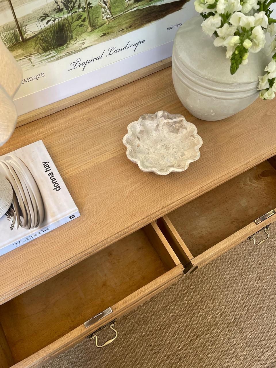 Discover timeless elegance with the Peppertree Chest of Drawers—a stunning solid teak piece that seamlessly blends vintage charm with modern convenience. Expertly restored to pristine condition, this spacious four-drawer chest features smooth-gliding drawers for effortless access to your belongings. The distinctive scalloped detailing adds character and sophistication to any room, while sturdy wheels make repositioning a breeze. Crafted entirely from quality teak wood, this substantial piece promises durability and enduring beauty. Perfect for those who appreciate authentic craftsmanship and functional design.