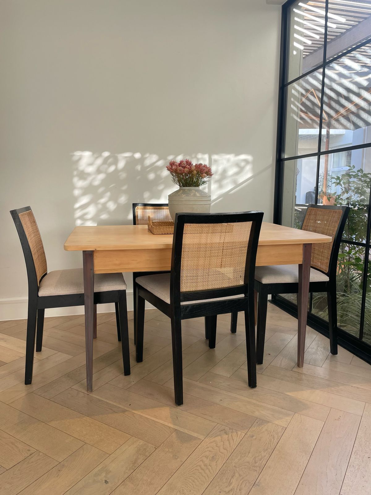 The Sunset Dining Table blends timeless charm with sturdy craftsmanship. Crafted from a striking mix of yellow and imbuia wood, this oversized 4-seater offers both character and durability. Perfectly restored and in excellent condition, it enhances any apartment or farmhouse kitchen. Its robust design invites memorable meals, while pairing it with modern chairs creates a stylish, contemporary dining space. Elevate your home with this unique and inviting table.