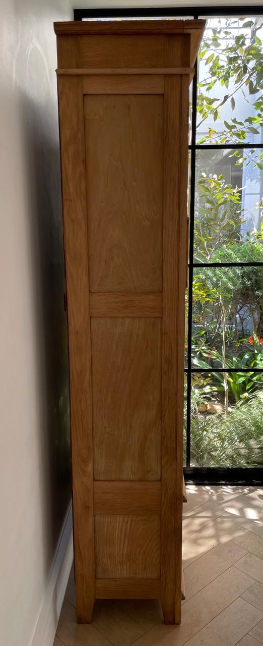 The Taylor Wardrobe, a restored solid Oak antique piece perfect for any home. Featuring a unique rattan door, intricate details, ample hanging space, and a spacious drawer, this cupboard is a functional and stylish addition to your space