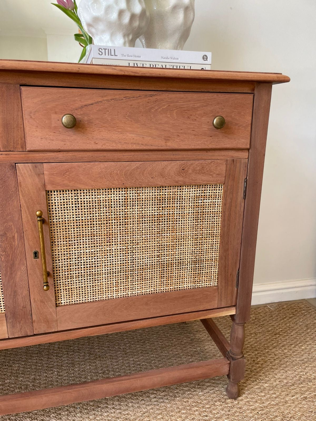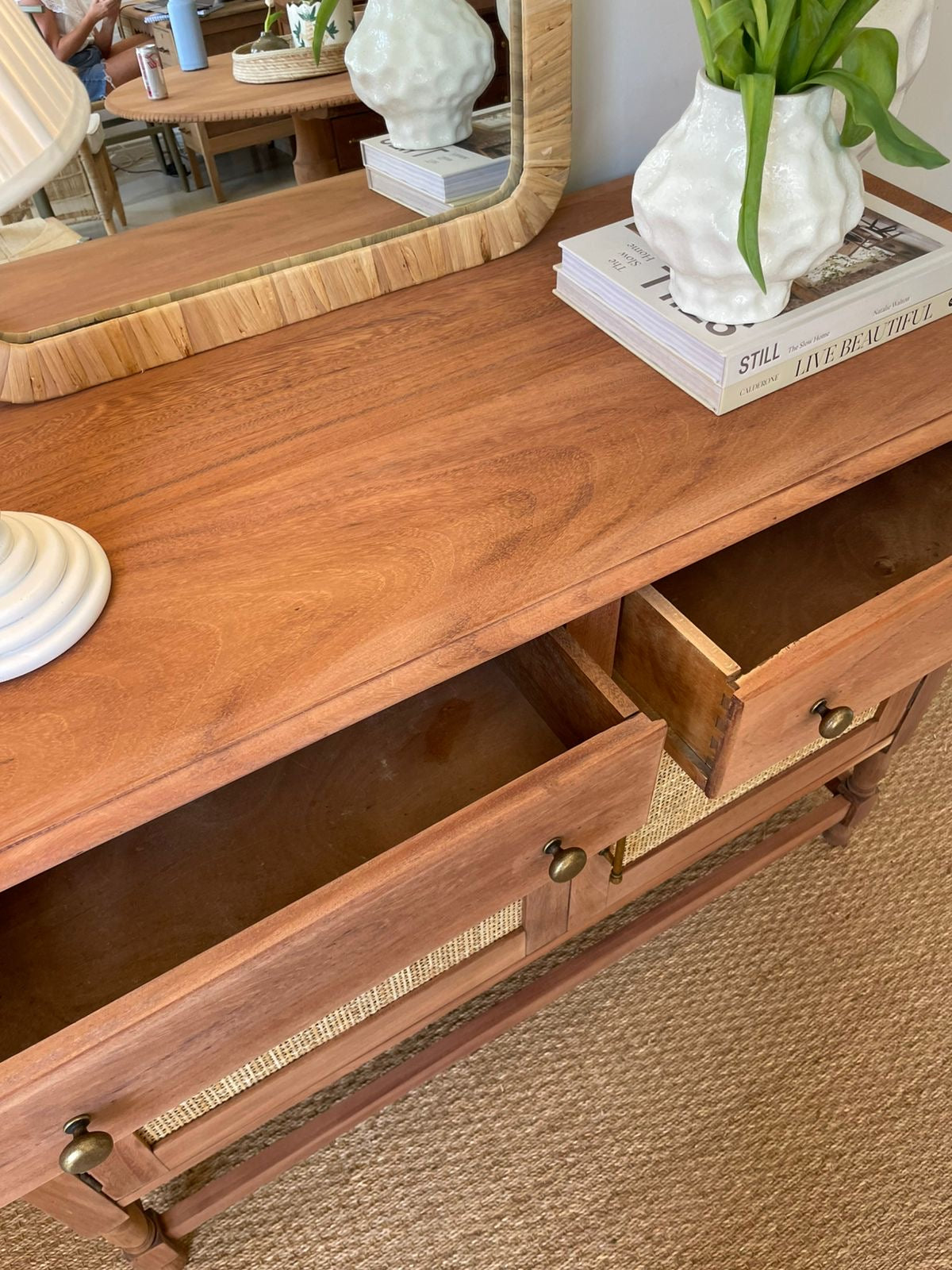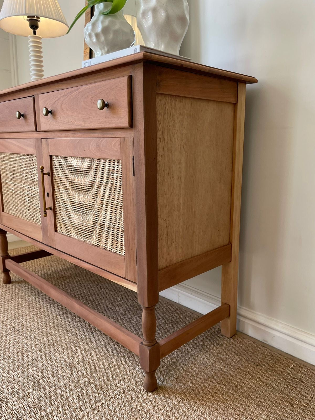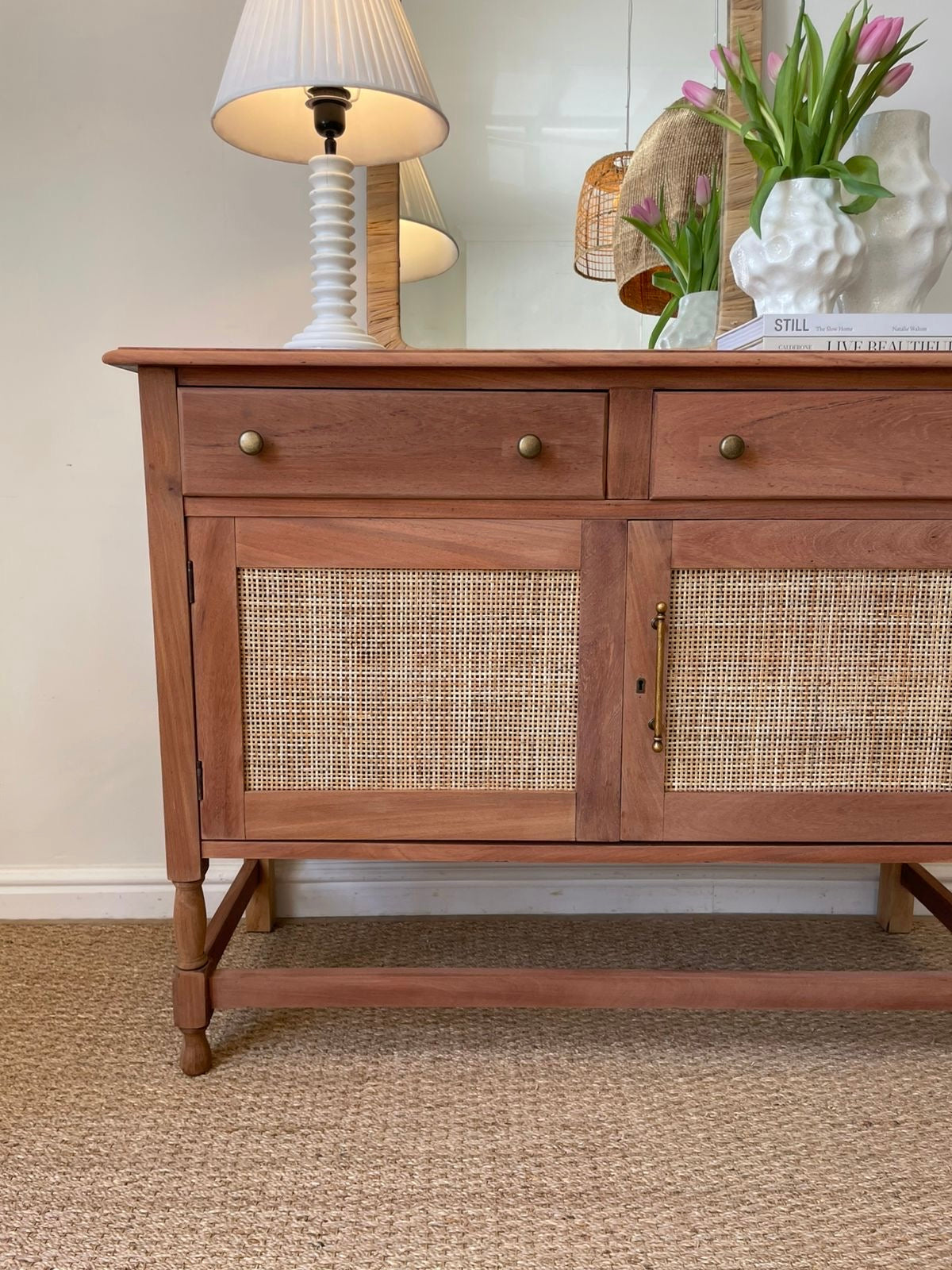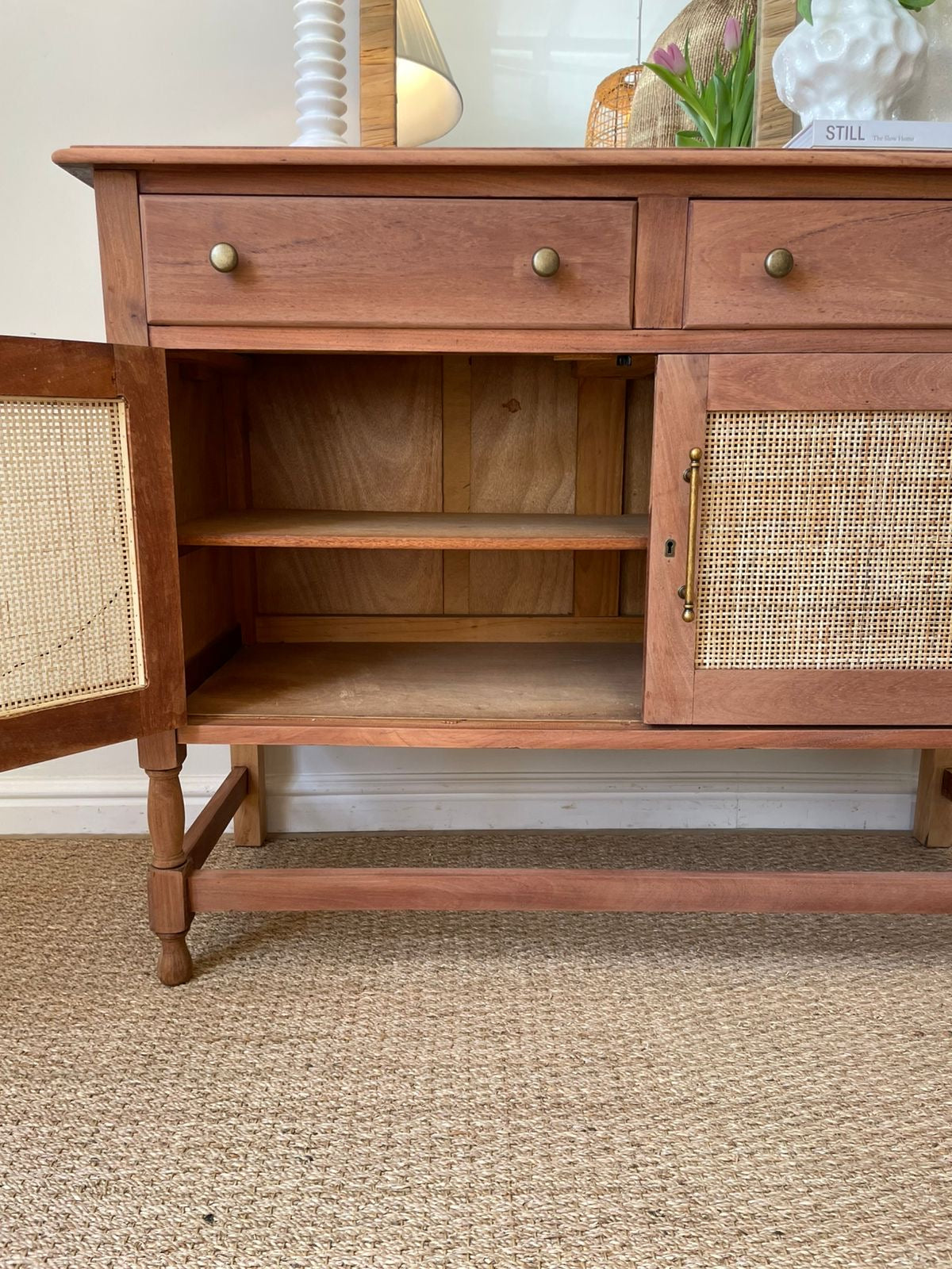 Discover timeless elegance with this exceptional Santiago Server/Sideboard—a one-of-a-kind masterpiece meticulously restored to pristine condition. Crafted from solid Mahogony, the interior shelf provides practical storage, while the rattan-inlaid doors add authentic character and visual interest. Detailed drawers fitted with brass-looking handles offer convenient organization. Perfect for those who appreciate vintage craftsmanship and enduring quality.